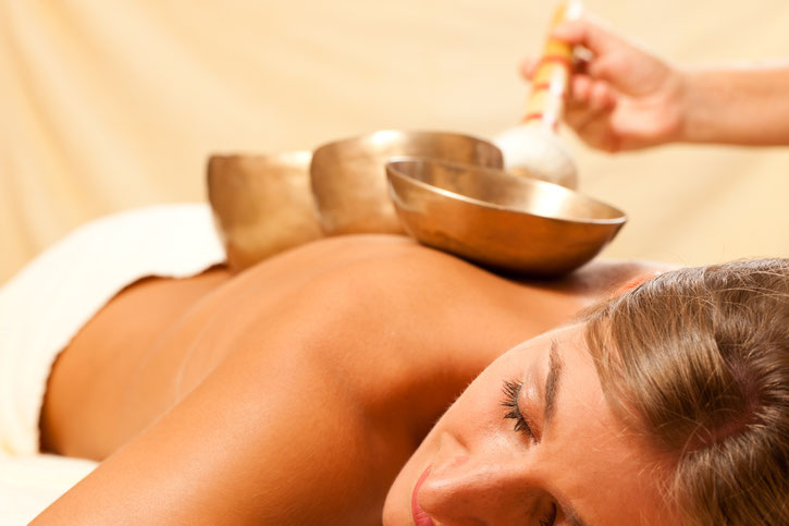 Bei der Klangschalenmassage werden die Klangschalen in einer bestimmten Reihenfolge auf den (bekleideten) Körper gestellt und angeklungen.